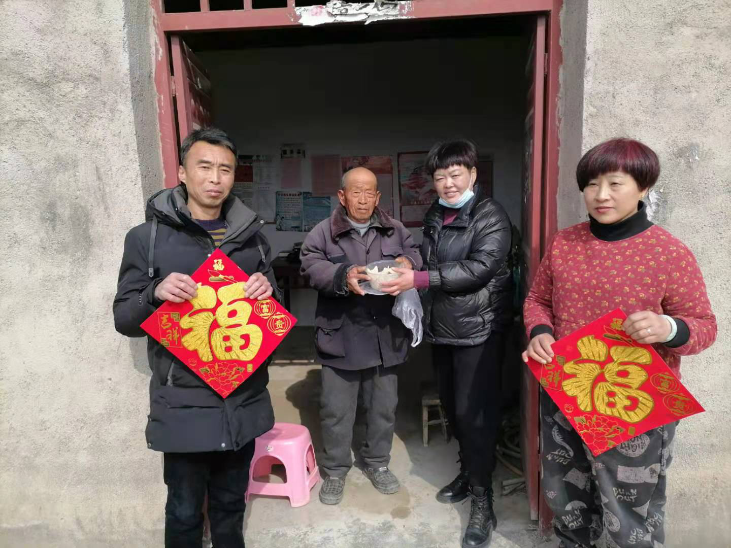 煮好了饺子,村干部和志愿者立刻打包装好,分头行动,把一碗碗热气腾腾的饺子和象征吉祥的大红福字送到贫困群众家中。