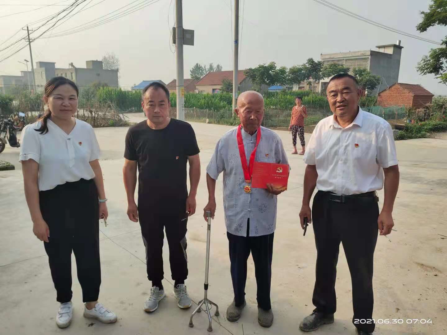 三桥村党支部副书记贺振海、党建负责人张金会、党员赵静于2021年6月29日为三桥村蒋庄老党员马秀文上门颁发”50党龄纪念章“。