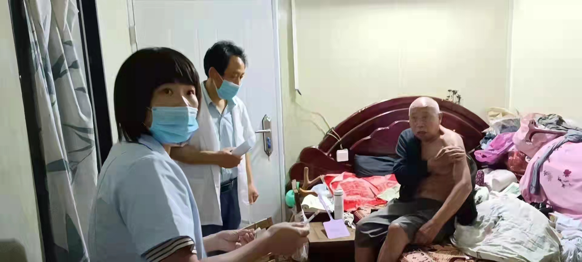 娄庄镇杨集村志愿者陪同镇卫生院医生为行动不便的老人入户接种疫苗